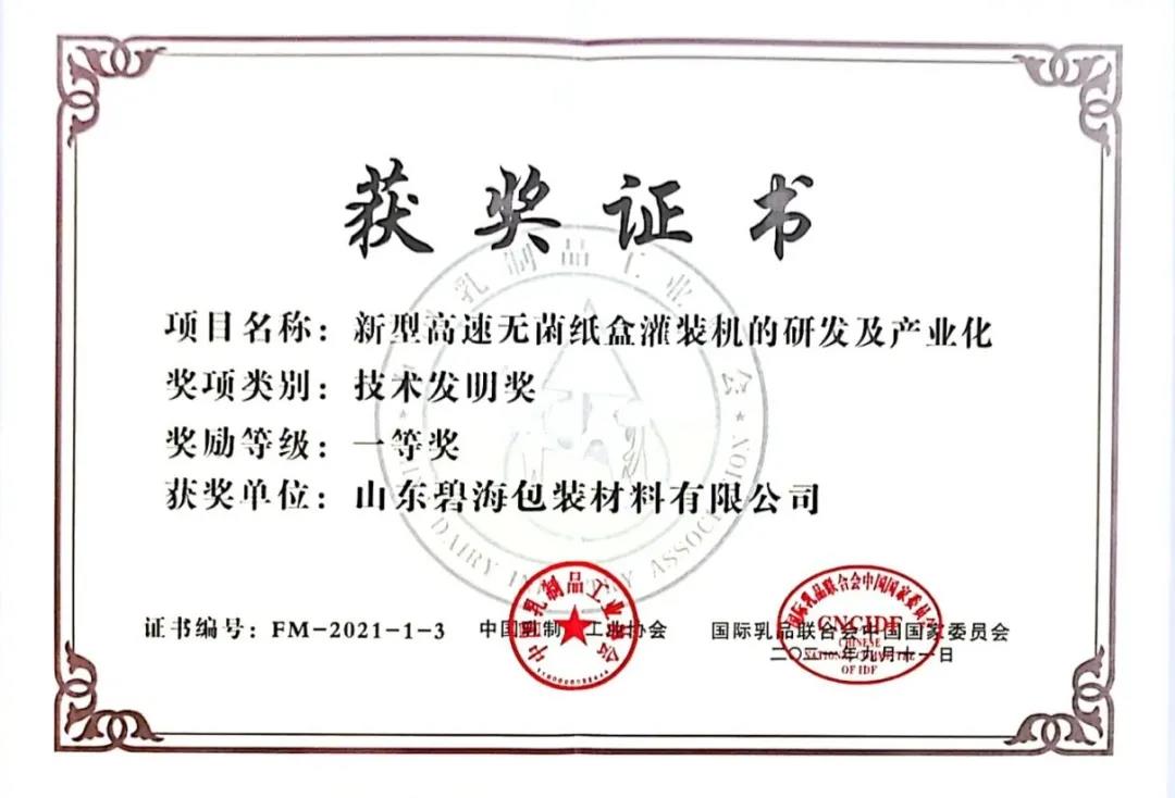 11日,在2021年度中國乳業(yè)科技系列頒獎盛典上,碧海包裝又一新型高速無菌紙盒灌裝機獲技術發(fā)明獎一等獎,公司執(zhí)行總經(jīng)理王立上臺接受頒獎。